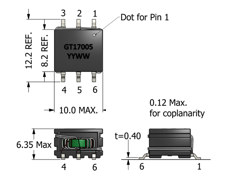 The GT17005’s SMT footprint (10.0 mm × 12.2 mm, 6.35 mm max height) makes it suitable for automated pick-and-place assembly. However, designers must plan for adequate solder pad design, board support, and thermal relief to ensure reliable long-term reliability in high-vibration or high-temperature environments.