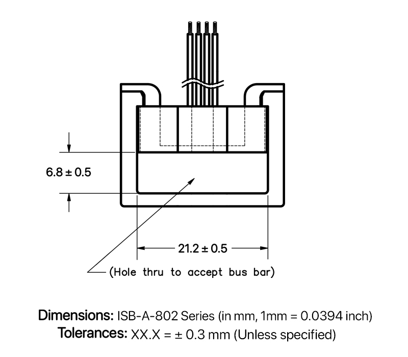 As the lead-wire version of the ISB-A-800 Series, the ISB-A-802 offers the same electrical performance in a wiring-flexible format suited for applications where direct PCB or busbar mounting is not possible. With 4300 VAC isolation, DC–200 kHz bandwidth, and a fast ~3 µs response, the series integrates easily into high-voltage and high-current environments where remote sensor placement is required.